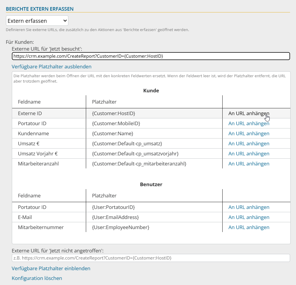 - Nutzen Sie optional Platzhalter, die portatour® beim Öffnen der URL mit den entsprechenden Werten füllt.