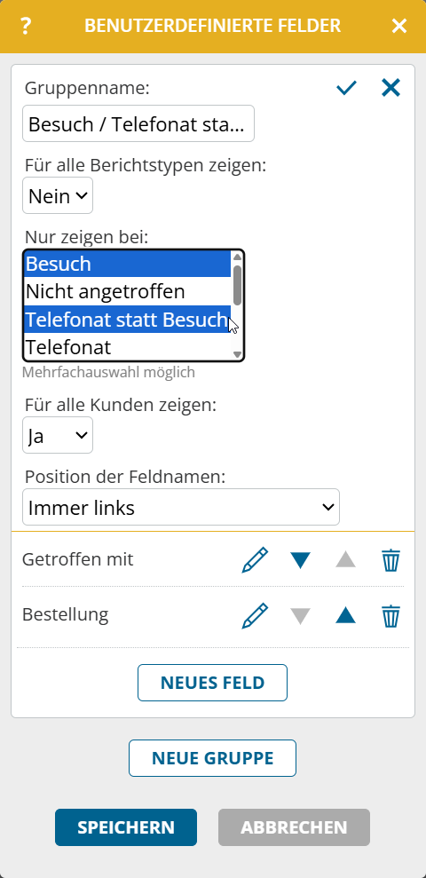 Bisher mündeten die drei Optionen „Telefonat statt Besuch“, „Telefonat“ und „sonstiger Bericht“ zum selben Berichtstyp „sonstiger Bericht“. Ab sofort gibt es für jeden dieser drei Fälle einen eigenen Berichtstyp. Das erlaubt es Ihnen die benutzerdefinierten Felder unterschiedlich zu konfigurieren.