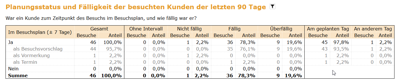 Zusätzlich gibt es den neuen Abschnitt „Planungsstatus und Fälligkeit der besuchten Kunden der letzten 90 Tage“. Dort sehen Sie eine Statistik auf Basis dieser Werte.