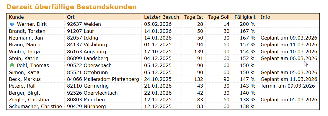 Im Abschnitt „Derzeit überfällige Bestandskunden“ wird jetzt auch angezeigt, wenn ein Besuch für diesen Kunden im Besuchsplan geplant ist.