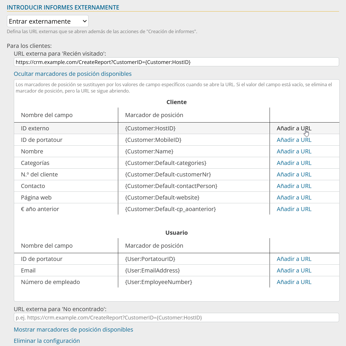 - Opcionalmente, utilice marcadores de posición que portatour® rellenará con los valores correspondientes cuando se abra la URL.