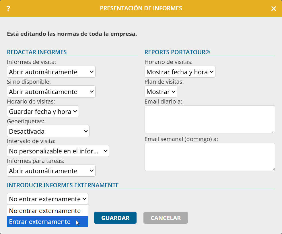- Configure «Introducir informes externamente» como «Entrar externamente«.