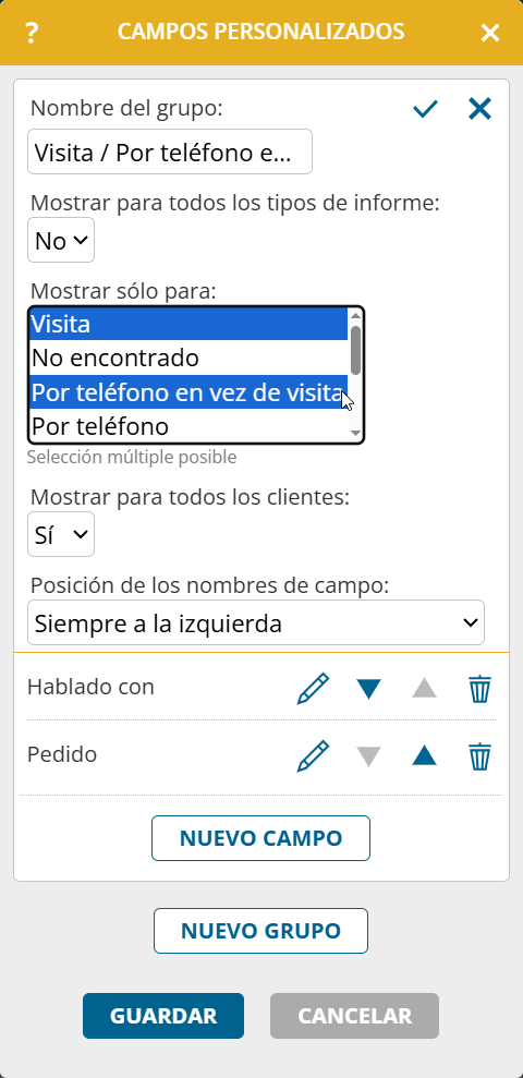 Anteriormente, las tres opciones «Por teléfono en vez de visita», «Por teléfono» y «Otro informe» se agrupaban en el tipo de informe «Otro informe». A partir de ahora, cada uno de estos tres casos tendrá su propio tipo de informe. Esto le permite configurar los campos personalizados de forma diferente.