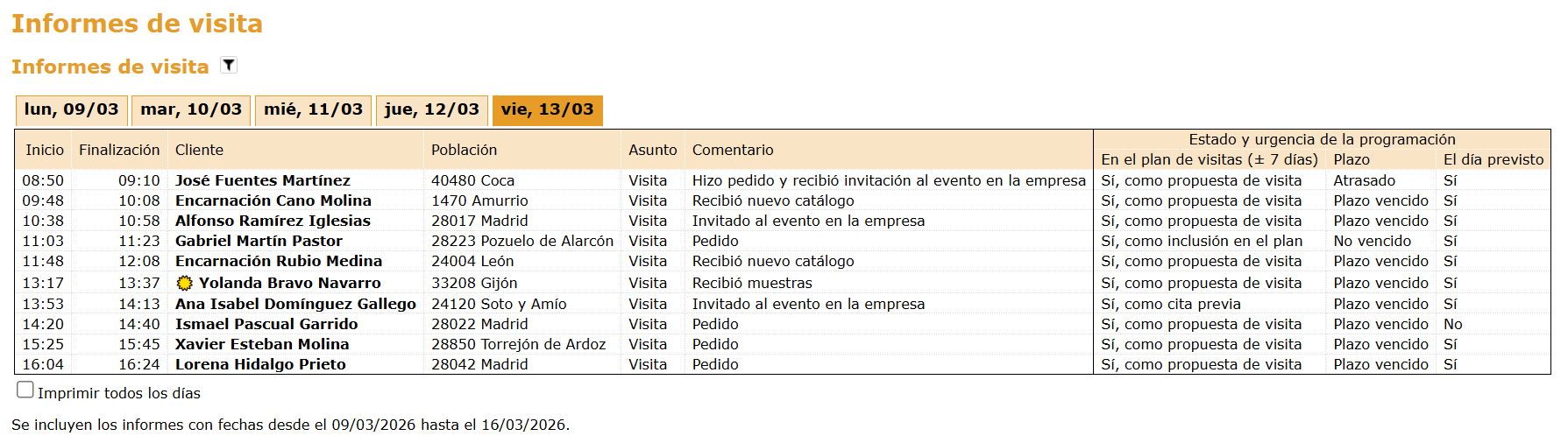 Estado y urgencia de la programación de los clientes visitados en el informe