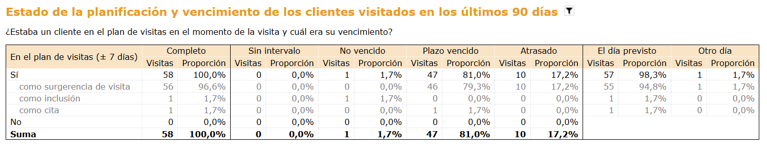 Además, existe la nueva sección «Estado de la planificación y vencimiento de los clientes visitados en los últimos 90 días«. Allí podrá ver unas estadísticas basadas en esos valores.