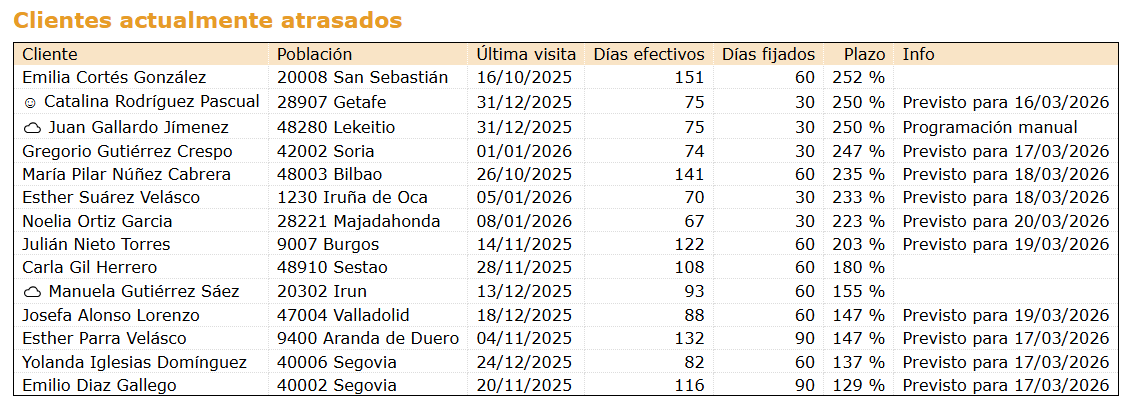 La sección «Clientes actualmente atrasados» ahora también se indica si hay una visita programada para ese cliente en el plan de visitas.