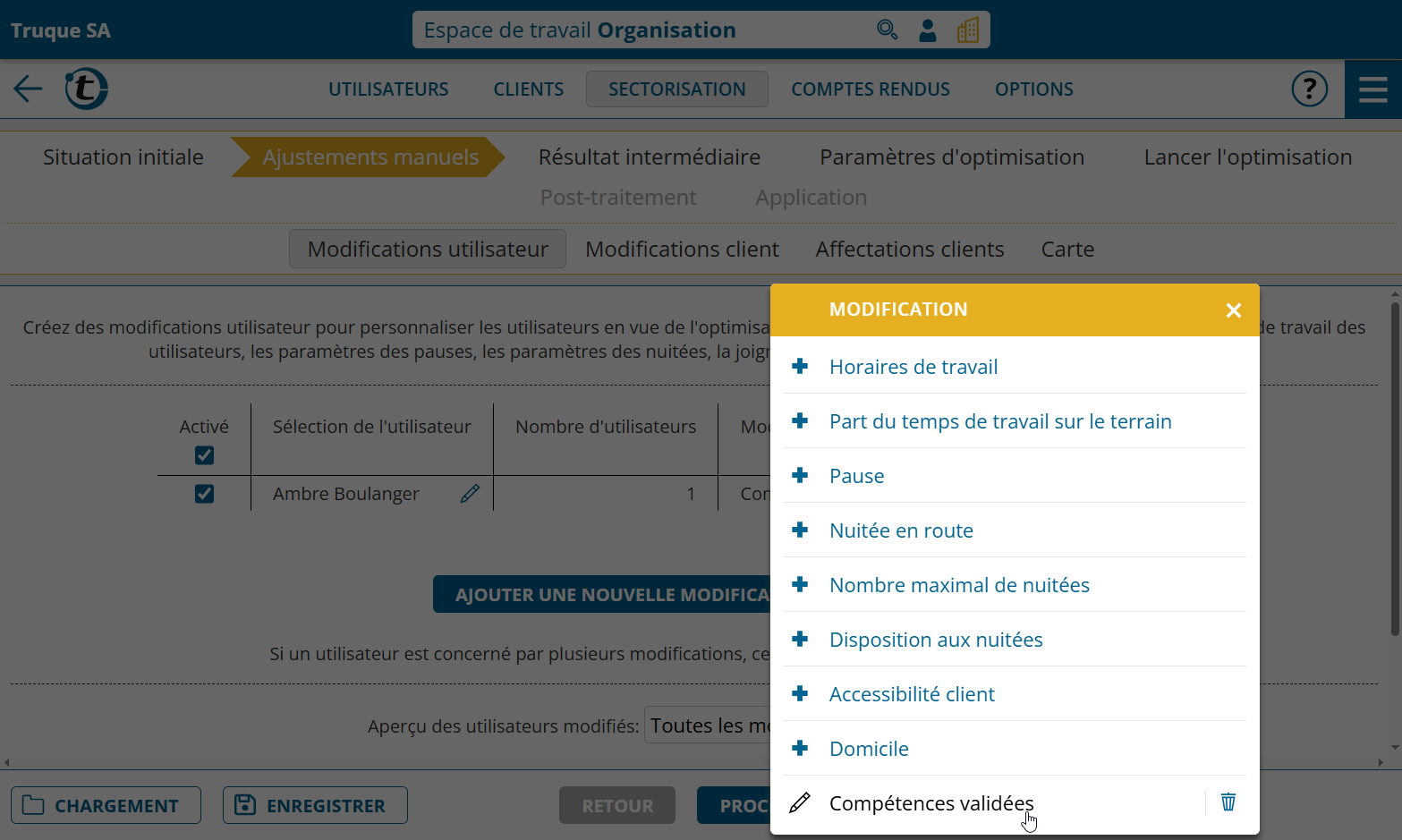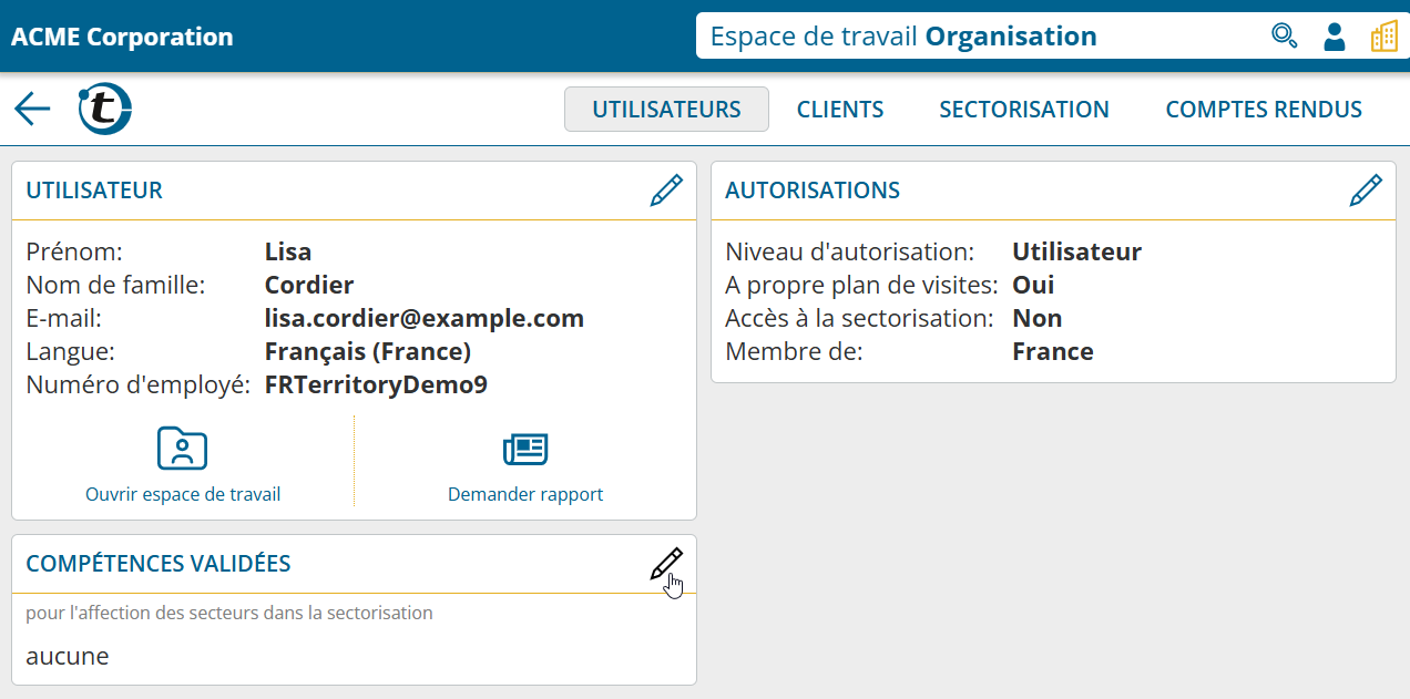 Dans l’espace de travail Organisation puis « Options > Autorisations », utilisez l’autorisation « Changer les compétences requises pour l’affectation des secteurs » si ces modifications peuvent être effectuées uniquement par les administrateurs, les superviseurs ou également par les utilisateurs.