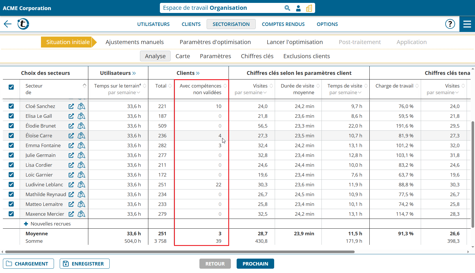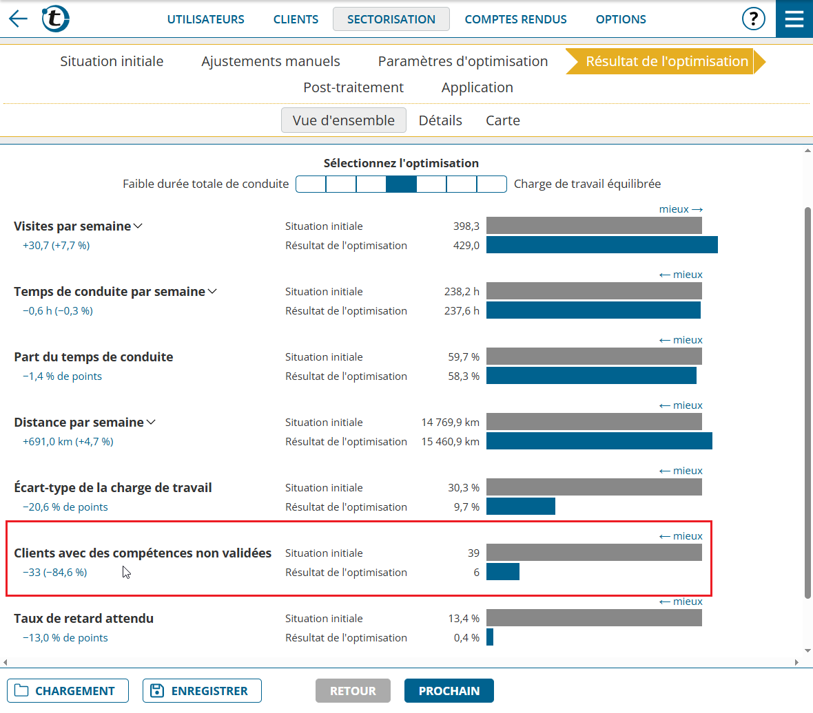 Dans l’aperçu du résultat de l’optimisation, la diminution du nombre de clients dont les compétences ne sont pas validées est affichée, le cas échéant.