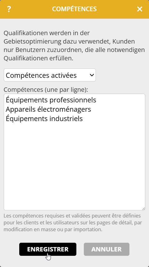 Remarque : Les compétences pour l’affectation des secteurs ne sont pas encore disponibles lorsque Dynamics CRM est utilisé comme système source de données pour portatour®.