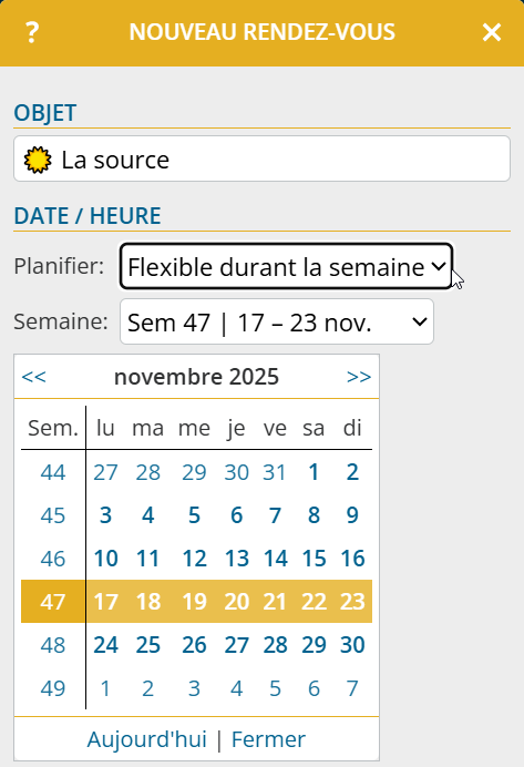 Les rendez-vous abonnés sont pris en compte par défaut dans la planification des tournées. Si vous ne souhaitez pas qu’un rendez-vous soit inclus, car il ne doit pas influencer votre tournée quotidienne, cliquez dans le menu contextuel ou dans la vue détaillée du rendez-vous sous « Actions » sur « Exclure le rendez-vous du plan de visite ». Dans le calendrier, ces rendez-vous sont affichés en gris avec un symbole approprié.