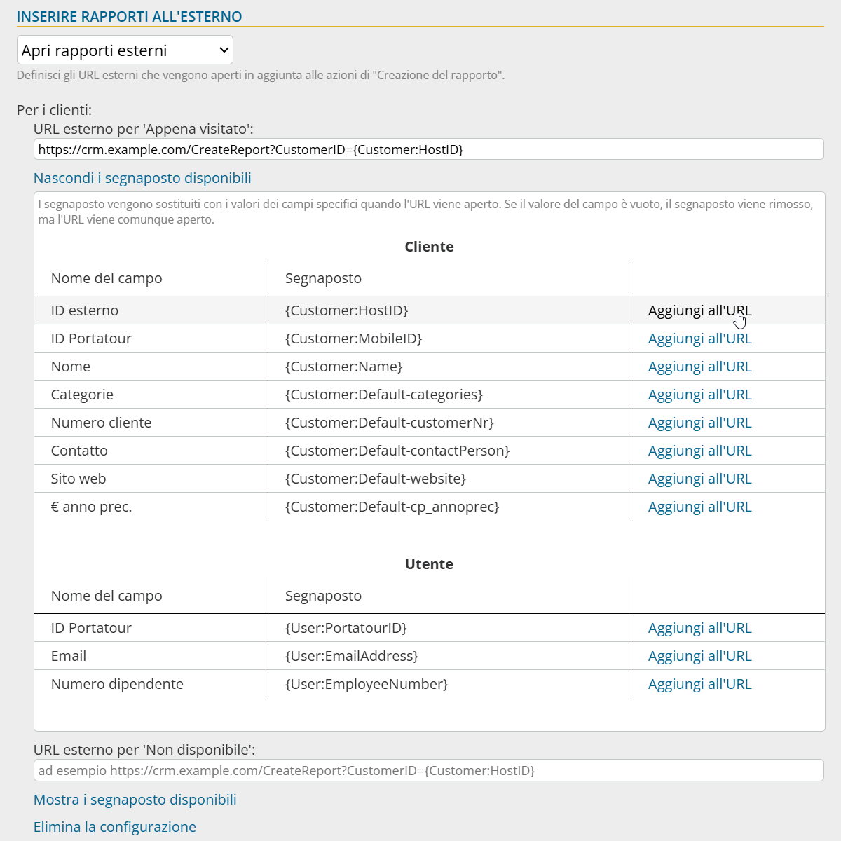 La tua azienda registra anche rapporti visita in un altro sistema? Puoi integrare portatour® senza problemi. Cliccando su “Appena visitato” o “Non disponibile” nella scheda di un cliente, portatour® apre l’URL esterno che hai configurato. Ciò consente di aprire la schermata di inserimento dati desiderata direttamente nel sistema esterno. Gli URL esterni vengono aperti in aggiunta al normale inserimento dei rapporti.