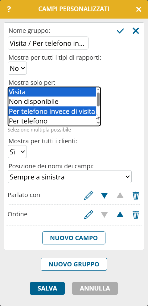 Finora, le tre opzioni “Per telefono invece di persona”, “Per telefono” e “Altro rapporto” creavano lo stesso tipo di rapporto “Altro rapporto”. D’ora in poi, verrà creato un tipo di rapporto separato per ciascuno di questi tre casi. Questo consente di configurare i campi definiti dall’utente in modo diverso.