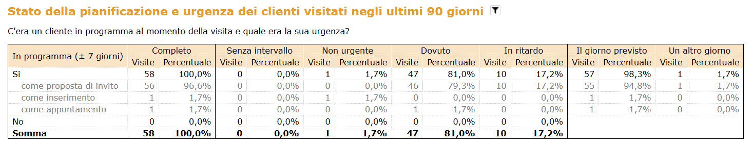 È disponibile inoltre una nuova sezione “Stato della pianificazione e urgenza dei clienti visitati negli ultimi 90 giorni“. Qui puoi vedere le statistiche basate su su questi valori.