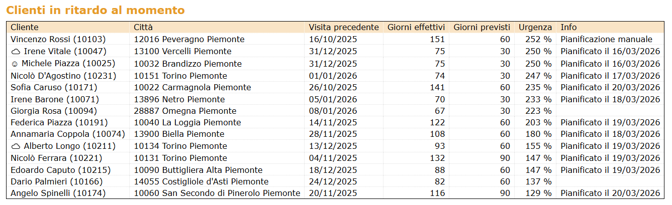 Nella sezione “Clienti in ritardo al momento” verrà inoltre mostrato se è già prevista in agenda una visita per questo cliente.