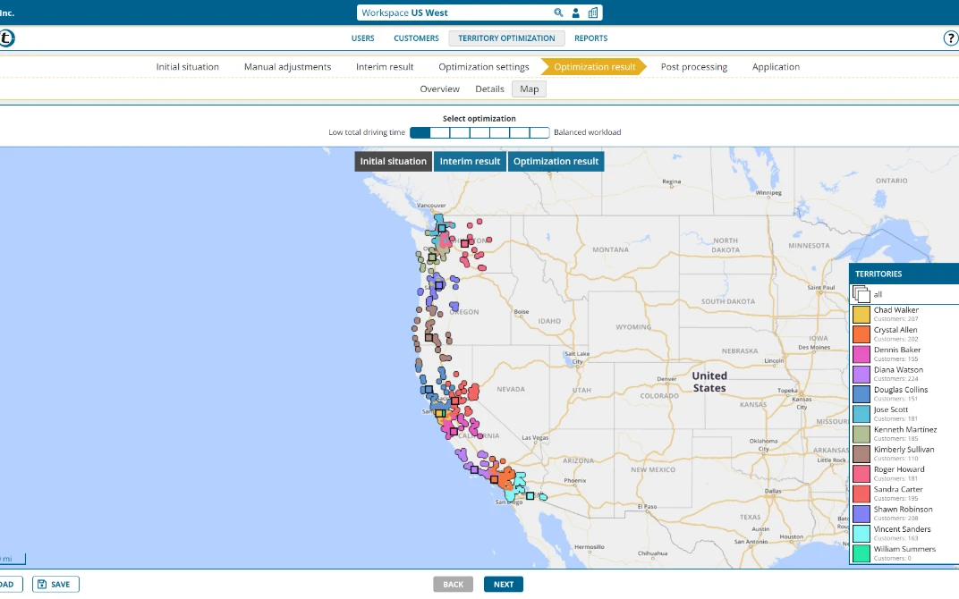 After mergers, territory expansions or personnel changes, sales territories are often cut illogically. portatour® Territory Optimization analyzes and creates fair and balanced sales territories.
